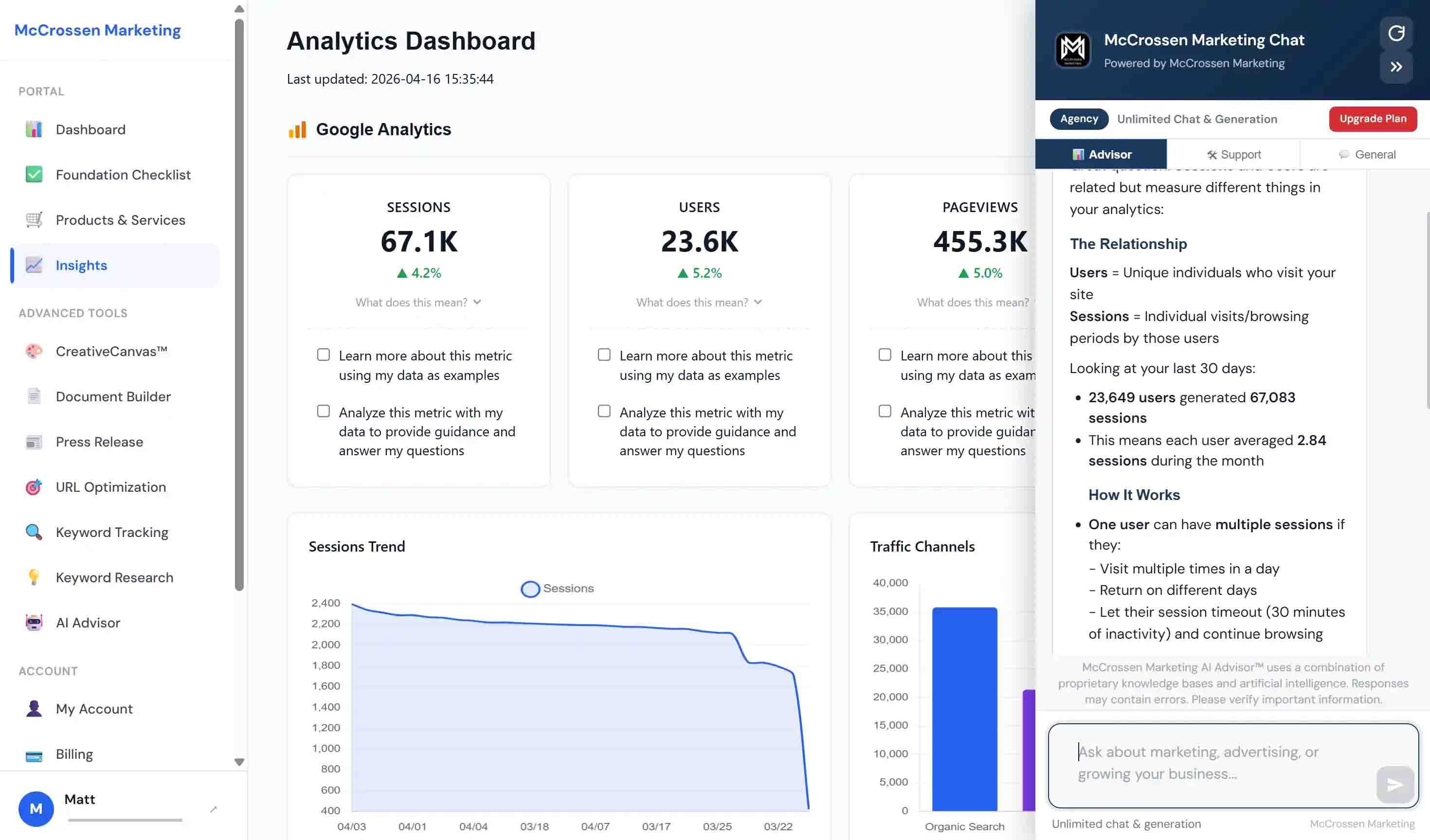 "I spent years running client marketing campaigns working directly with business owners, navigating siloed dashboards, unconnected reporting tools, and lengthy emails," said Matt McCrossen, Founder of McCrossen Marketing. "Clients didn't need more charts. They needed someone who could look at their data and tell them what to do next. That's what this platform does — except it's available at 2 a.m. on a Sunday and it never sends you an invoice for a phone call."